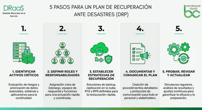 Contar con un plan de recuperación ante desastres (DRP) es clave para garantizar la continuidad. Un DRP bien diseñado permite restaurar operaciones críticas de forma rápida y segura , minimizando el impacto de cualquier incidencia. En este artículo, explicamos qué debe incluir un DRP y cómo Brontobyte Cloud puede ayudarte a implementarlo y automatizarlo mediante su servicio DRaaS con Veeam Cloud Connect , sobre infraestructura propia en IPCore Madrid . Paso 1: Identificar los activos y procesos críticos El primer paso es determinar qué elementos de tu negocio son esenciales: Datos y aplicaciones : información de clientes, sistemas financieros y aplicaciones imprescindibles para la operación. Infraestructura tecnológica : servidores, redes y dispositivos que soportan procesos críticos. Procesos esenciales : actividades que no pueden detenerse sin afectar la continuidad del negocio, como facturación, logística o atención a clientes. Tip práctico: Realiza un Análisis de Impacto en el Negocio (BIA) para priorizar los activos más importantes según su criticidad. Paso 2: Definir roles y responsabilidades Para que un DRP funcione, es fundamental que cada persona sepa qué hacer: Responsables de ejecución : quienes llevarán a cabo la recuperación de sistemas y datos. Responsables de comunicación : quienes informarán a clientes, proveedores y equipo interno. Contactos críticos : proveedores, soporte técnico y partners estratégicos. Con Brontobyte Cloud , las empresas clientes cuentan con soporte especializado remoto , capaz de asistir en la gestión de replicación, failover/failback y resolución de incidencias según SLA definido, sin necesidad de presencia física constante. Paso 3: Establecer estrategias de recuperación Aquí se define cómo se recuperarán los sistemas y datos: DRaaS con Veeam Cloud Connect : permite replicar máquinas virtuales desde la infraestructura del cliente (on-premise o IaaS) hacia nuestro cluster VMware en IPCore Madrid. Replicación eficiente y segura : mediante compresión, deduplicación y cifrado TLS, con políticas flexibles de RPO y RTO. Failover y failback automatizados : activación de las VMs replicadas y retorno al entorno original sin interrumpir el servicio. Recursos iniciales gratuitos : durante el primer mes tras un desastre, los recursos del entorno de recuperación se pueden utilizar sin coste adicional. Analogía: Un DRP funciona como un cinturón de seguridad: no evita los incidentes, pero asegura que tu negocio pueda seguir operando rápidamente. Paso 4: Documentar y comunicar el plan Un DRP solo es útil si todos saben cómo aplicarlo: Documenta procedimientos paso a paso para la recuperación de sistemas y datos. Define cronogramas y prioridades según la criticidad de cada activo y proceso. Mantén contactos de emergencia y proveedores clave actualizados. Con la consola Veeam Service Provider Console , las empresas clientes pueden gestionar réplicas, orquestar failover/failback y generar informes de forma centralizada, manteniendo autonomía y control total . Paso 5: Probar, revisar y actualizar El DRP debe ser dinámico y actualizado: Simulacros anuales : Brontobyte Cloud incluye al menos un Test Failover anual en red aislada para validar aplicaciones y procesos sin afectar producción. Monitorización y alertas : panel en tiempo real y generación automática de informes semanales y mensuales. Revisión continua : ajustes según cambios en infraestructura, aplicaciones o procesos críticos. Consejo: Las pruebas periódicas generan confianza y permiten detectar errores antes de un incidente real. Ventajas de DRaaS de Brontobyte Cloud en IPCore Madrid Al implementar tu DRP con nuestro servicio, obtienes: Seguridad física de primer nivel : racks con cierre de combinación, videovigilancia integral y sistemas antiincendios conforme a normativas europeas. Infraestructura robusta : suelo técnico elevado, climatización con pasillos fríos/calientes y redundancia eléctrica 2N con SAI y grupos electrógenos. Alta disponibilidad y conectividad : centro carrier-neutral con acceso a más de 10 operadores, enlaces DCI, fibra oscura, satélite y RF. Autonomía y control : gestión completa de réplicas, failover/failback y monitorización mediante VSPC. Certificaciones y cumplimiento : ISO 9001, 50001, 14001, 27001 y ENS nivel medio. Modelo transparente : pago por TB, VM o licencia, sin costes ocultos, y recursos del primer mes incluidos en caso de desastre. Soporte profesional B2B : asistencia remota especializada adaptada a las necesidades de cada cliente, con SLA definido y tiempos de respuesta claros. Conclusión Un DRP bien implementado garantiza continuidad, seguridad y tranquilidad. Con Brontobyte Cloud y DRaaS con Veeam Cloud Connect, las empresas pueden replicar sus VMs de forma segura, automatizar failover y failback, y acceder a infraestructura de alto nivel en IPCore Madrid , todo bajo un modelo B2B profesional y confiable. Prepararse no genera alarma; significa actuar con inteligencia y profesionalismo , sabiendo que tus sistemas y datos críticos están protegidos y gestionados por expertos.